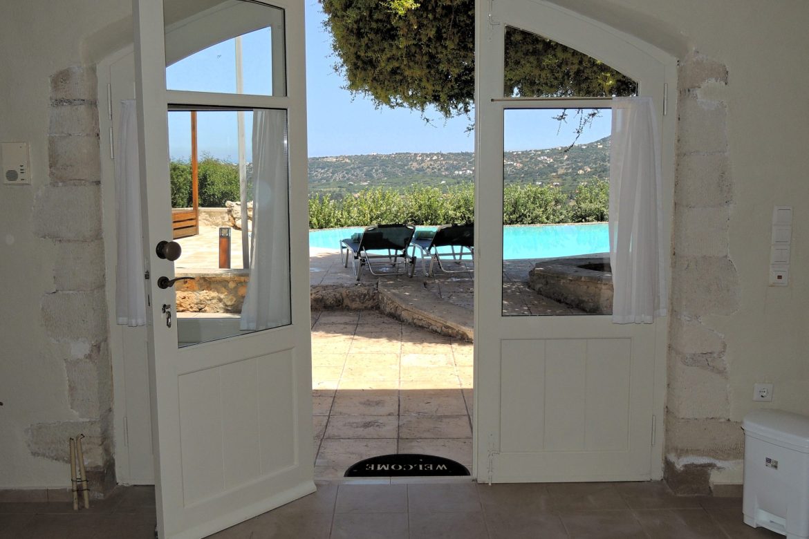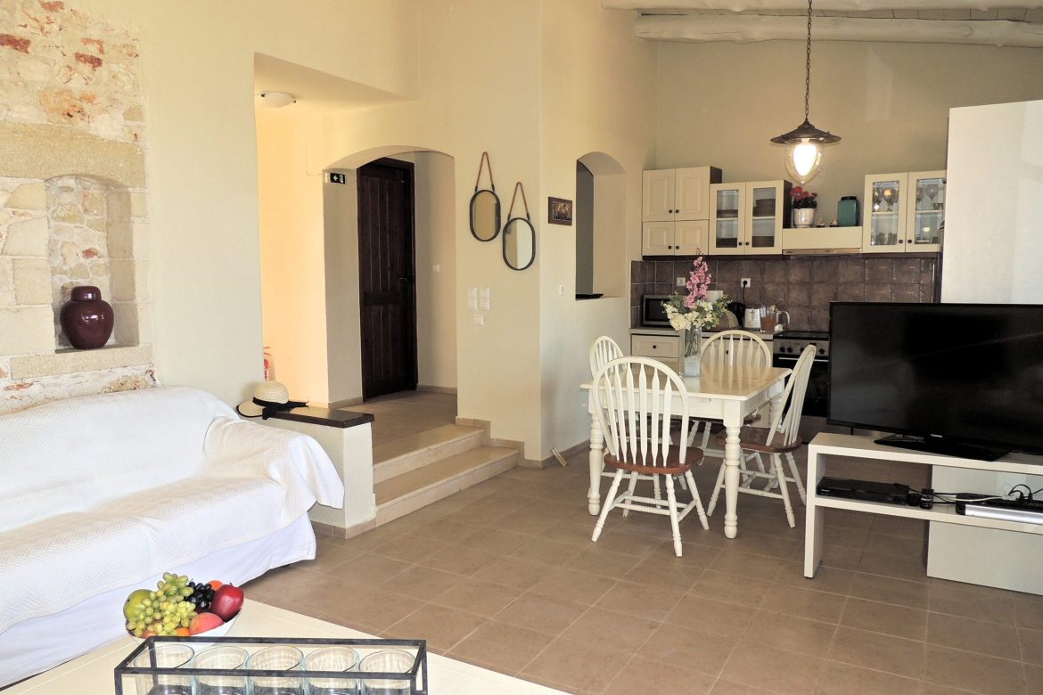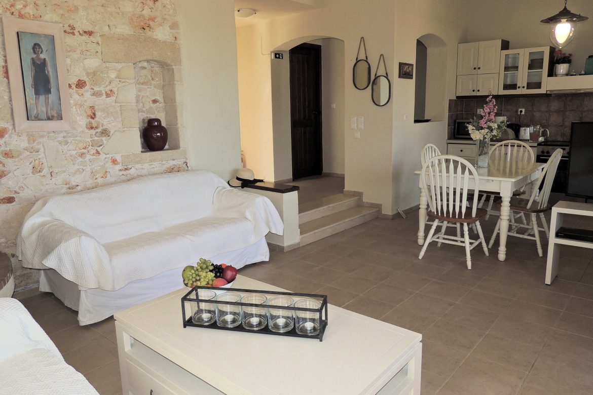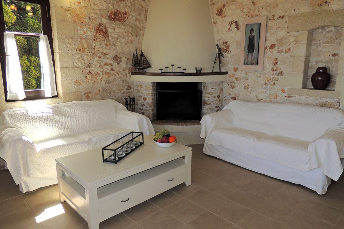 Μια παλιά πέτρα μύλων 200 ετών, που στο παρελθόν την χρησιμοποιούσαν για να αλέθουν σιτάρι και άλλους σπόρους, διακοσμεί την κύρια πόρτα εισόδου στην βίλλα Πρινόλιθος και βάζει τον τόνο, του τι θα δει ο επισκέπτης, μπαίνοντας στην βίλλα. Η παραδοσιακή κουζίνα με ενιαίο καθιστικό με τζάκι, σας κάνει να νιώσετε σαν στο σπίτι σας. Οι μεγάλες ξύλινες πόρτες οδηγούν σε ένα πολύ ευρύχωρο επιπλωμένο μπαλκόνι με θέα την πισίνα, τους ελαιώνες στο Γαβαλοχώρι και την παραλία της Αλμυρίδας.
