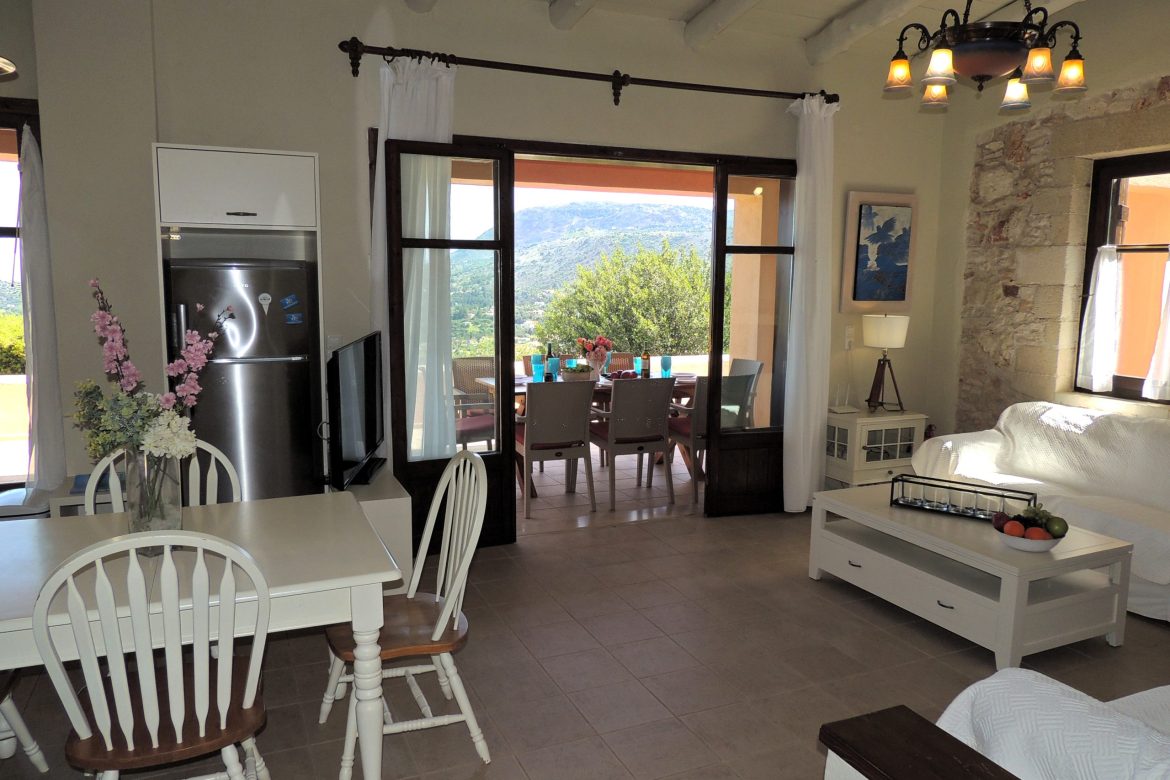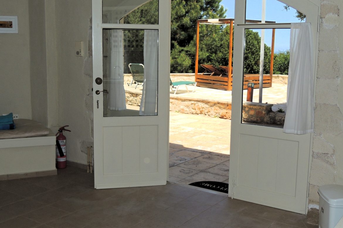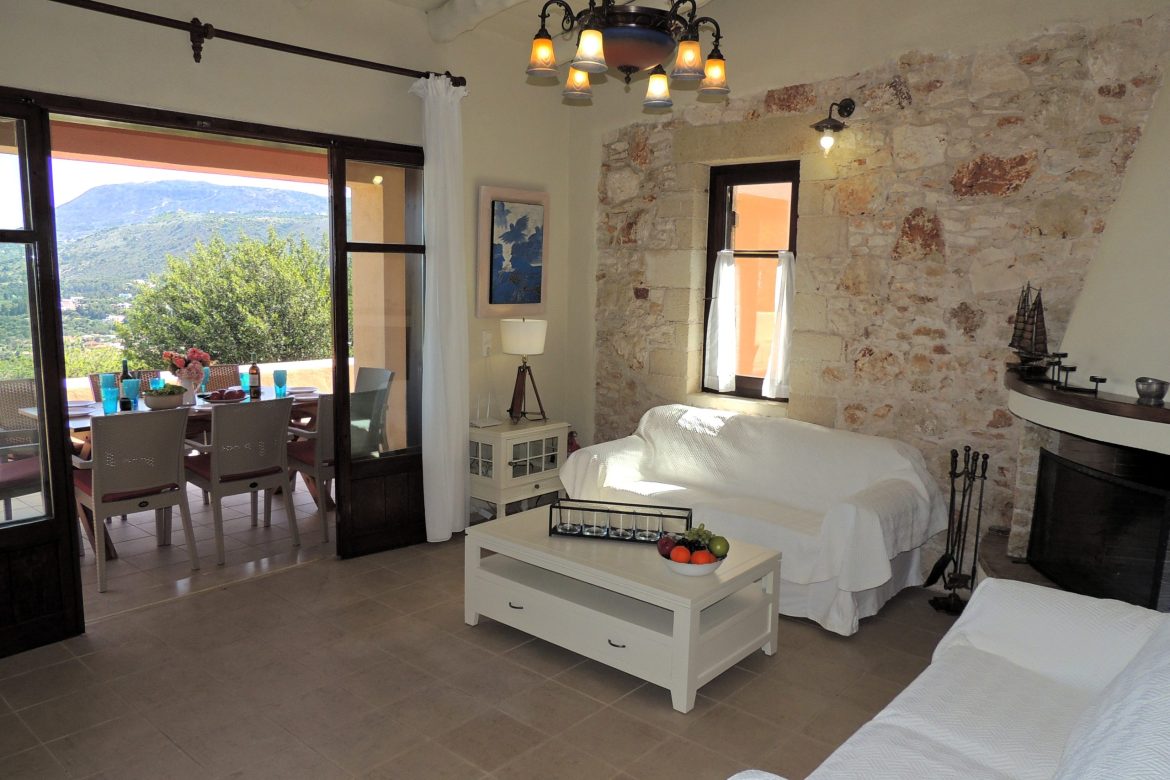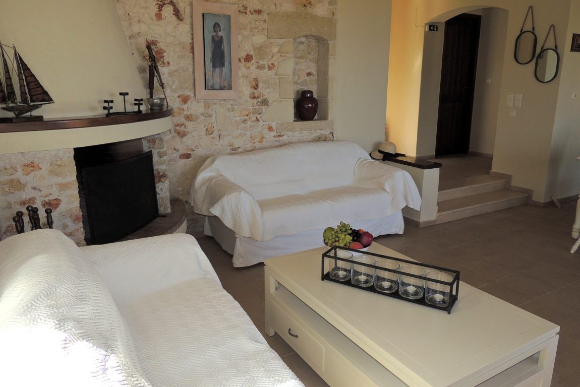 Μια παλιά πέτρα μύλων 200 ετών, που στο παρελθόν την χρησιμοποιούσαν για να αλέθουν σιτάρι και άλλους σπόρους, διακοσμεί την κύρια πόρτα εισόδου στην βίλλα Πρινόλιθος και βάζει τον τόνο, του τι θα δει ο επισκέπτης, μπαίνοντας στην βίλλα. Η παραδοσιακή κουζίνα με ενιαίο καθιστικό με τζάκι, σας κάνει να νιώσετε σαν στο σπίτι σας. Οι μεγάλες ξύλινες πόρτες οδηγούν σε ένα πολύ ευρύχωρο επιπλωμένο μπαλκόνι με θέα την πισίνα, τους ελαιώνες στο Γαβαλοχώρι και την παραλία της Αλμυρίδας.
