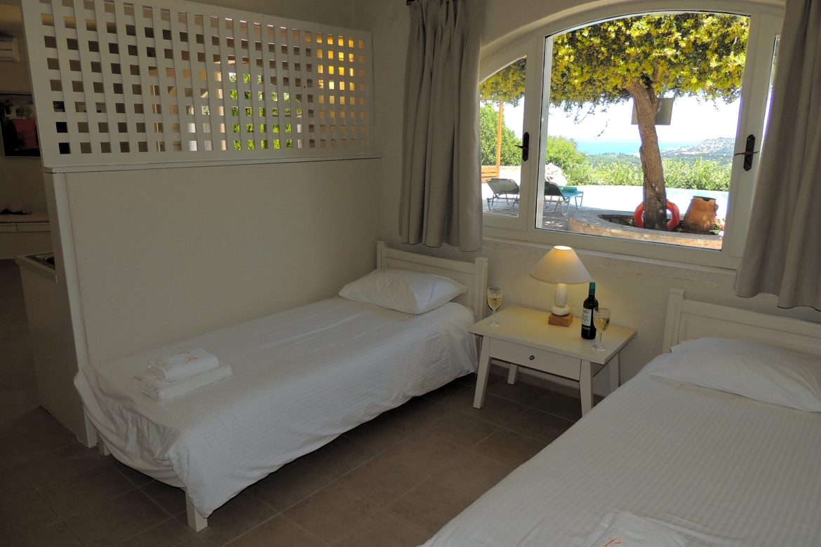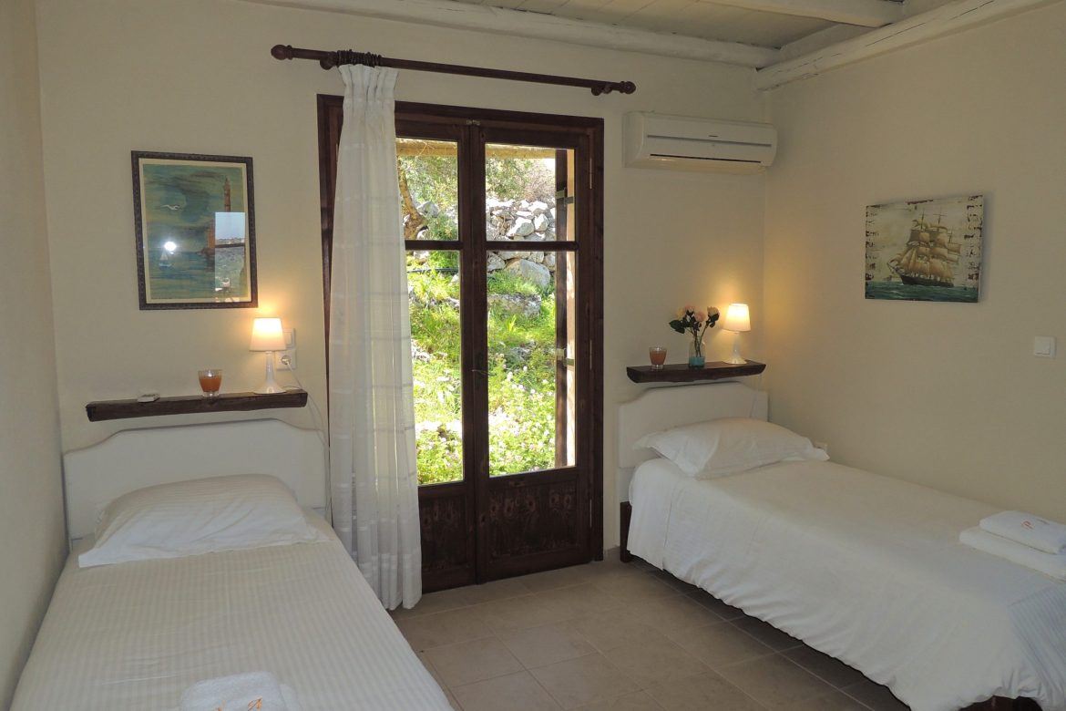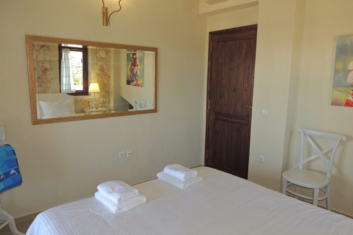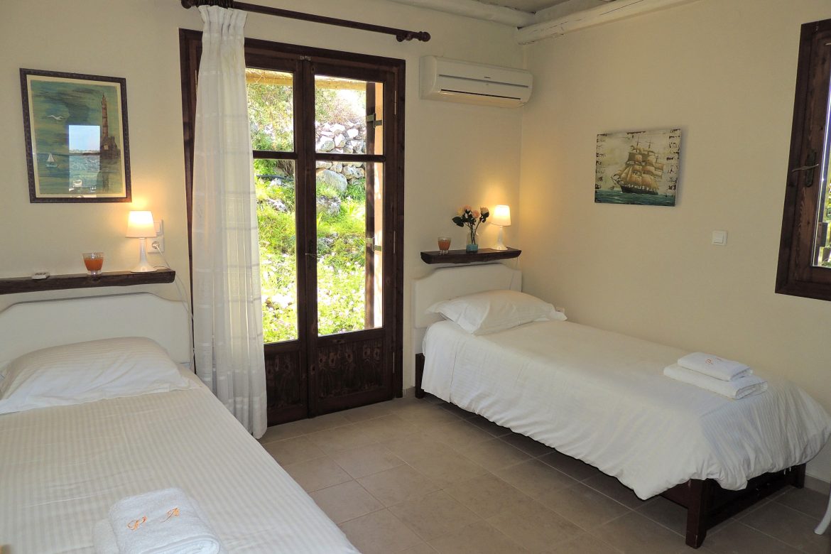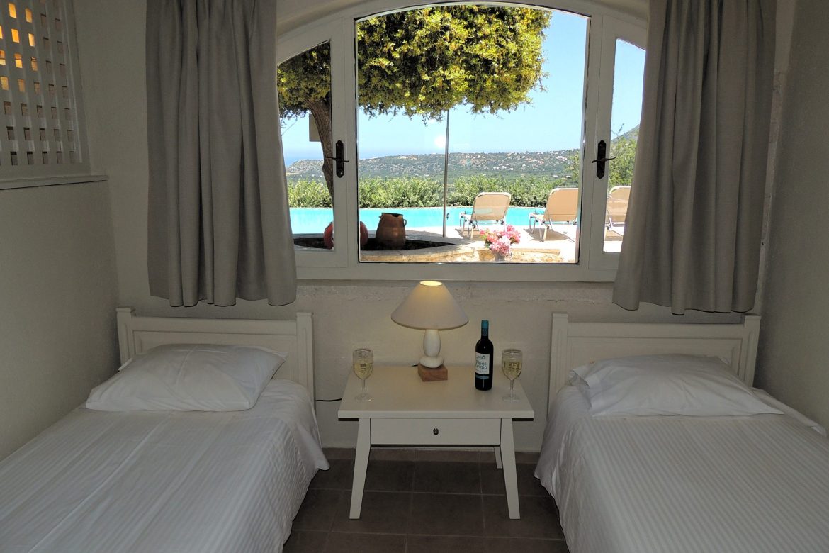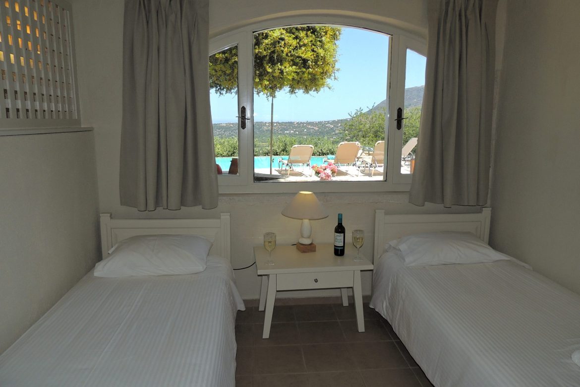 Στο ίδιο επίπεδο θα βρείτε δύο υπνοδωμάτια και ένα σύγχρονο ανακαινισμένο μπάνιο με πλυντήριο ρούχων. Το ένα υπνοδωμάτιο διαθέτει διπλό κρεβάτι και μπαλκονόπορτες που οδηγούν στο μεγάλο μπαλκόνι με θέα στην πισίνα, το άλλο διαθέτει δύο μονά κρεβάτια (που μπορούν να ενωθούν) και μπαλκονόπορτες που οδηγούν στην αυλή εισόδου των βιλών.