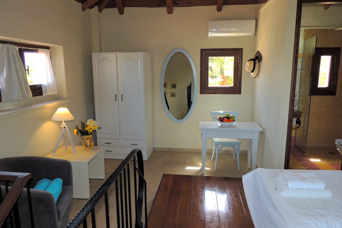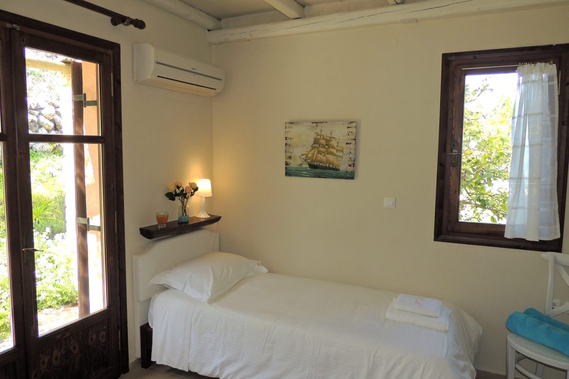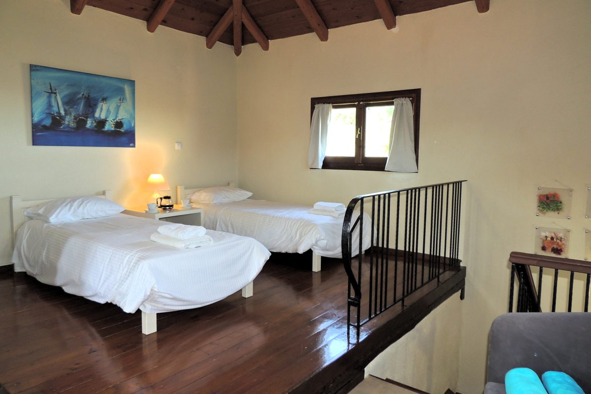 Το τρίτο υπνοδωμάτιο (μεζονέτα-στυλ) είναι στον επάνω όροφο. Ξύλινη εσωτερική σκάλα οδηγεί σε αυτό το ανοικτό δωμάτιο με δύο κρεβάτια. Ευρύχωρο με ξύλινο πάτωμα, ψηλές ξύλινες οροφές, παράθυρα με όμορφη θέα, θάλασσα και βουνό σε ανοικτό ορίζοντα, μια περιοχή υπολογιστή και ένα μικρό μπάνιο (με ντους).