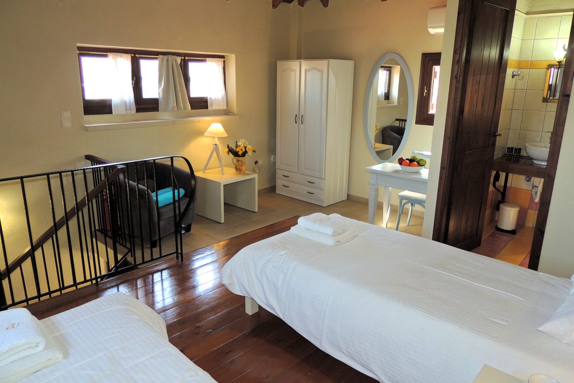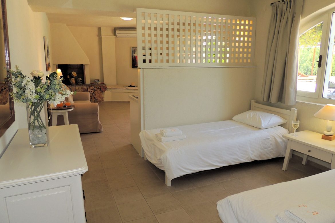 Κρεβάτια: 1 μεγάλο διπλό κρεβάτι & 4 μονά κρεβάτια που ενώνονται σε διπλό ,2 μονά κρεβάτια & 1 καναπέ-κρεβάτι